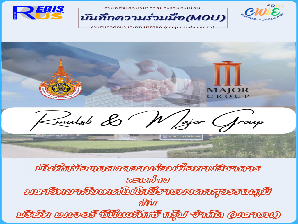 มทร.สุวรรณภูมิและบริษัท เมเจอร์ ซีนีเพล็กซ์ กรุ้ป จำกัด (มหาชน) ร่วมลงนามบันทึกข้อตกลงความร่วมมือทางวิชาการด้านการจัดการสหกิจศึกษาและการศึกษาเชิงบูรณาการกับการทำงาน