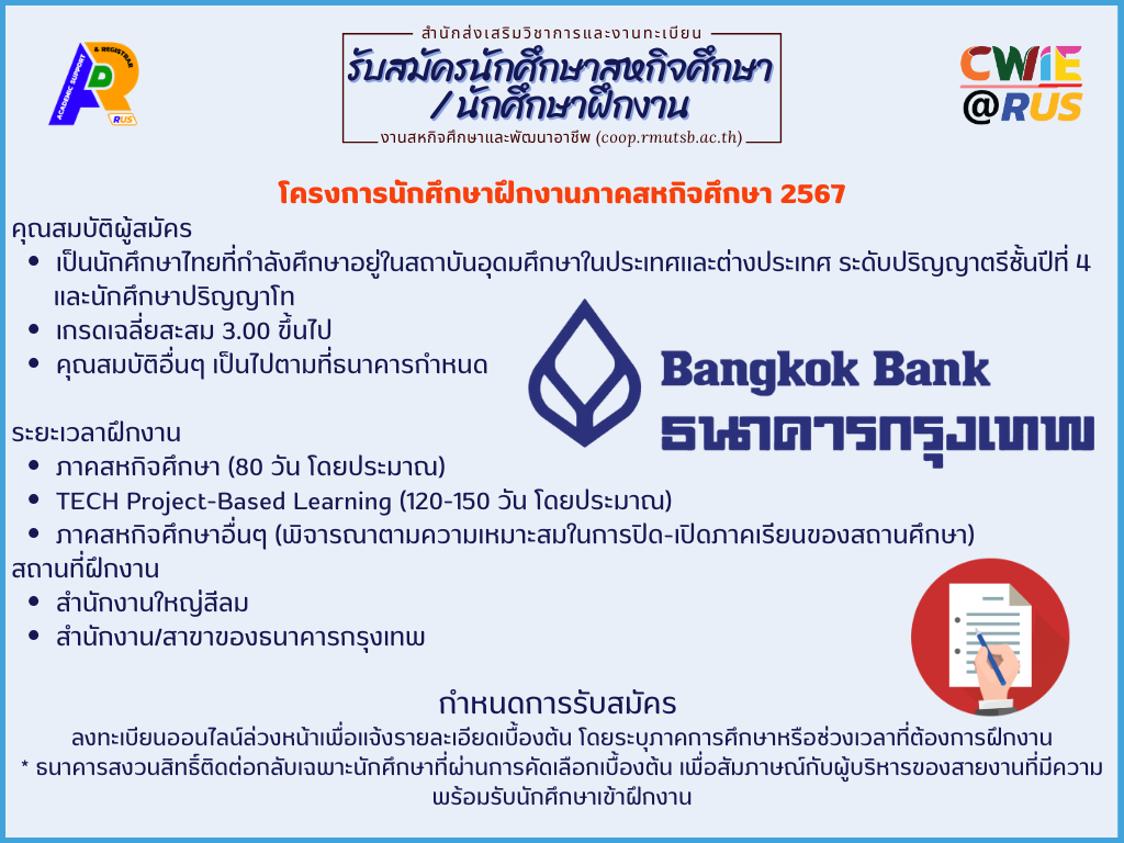 โครงการนักศึกษาฝึกงานภาคสหกิจศึกษา 2567 ธนาคารกรุงเทพ