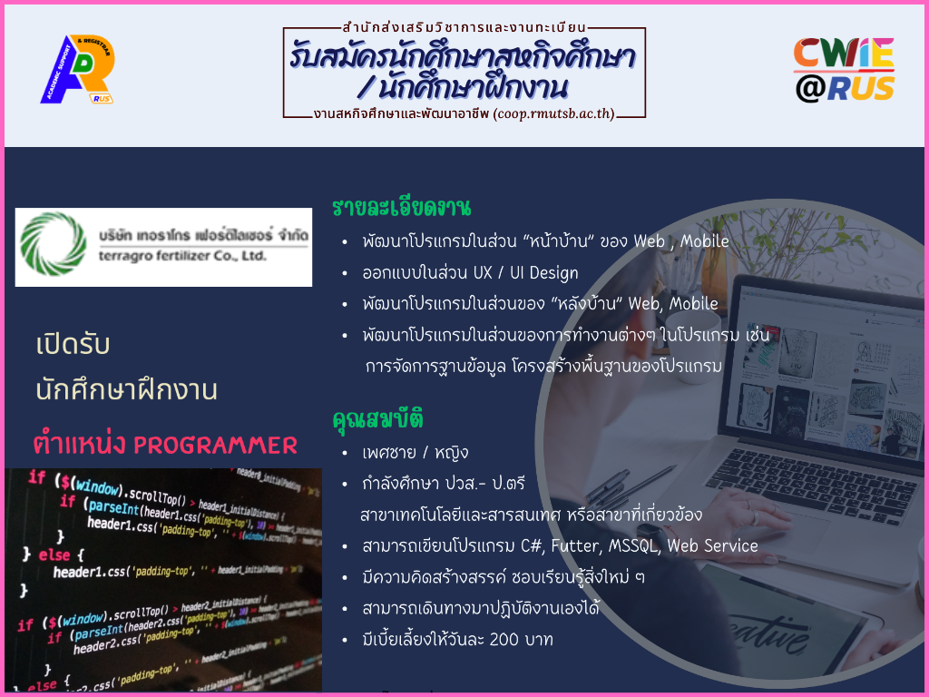 บริษัท เทอราโกร เฟอร์ติไลเซอร์ จำกัด ขอประชาสัมพันธ์ รับนักศึกษาฝึกงาน ตำแหน่ง Programmer