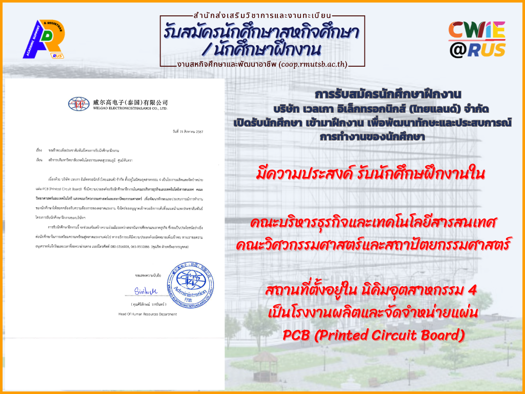 การรับสมัครนักศึกษาฝึกงาน บริษัท เวลเกา อิเล็กทรอกนิกส์ (ไทยแลนด์) จำกัด