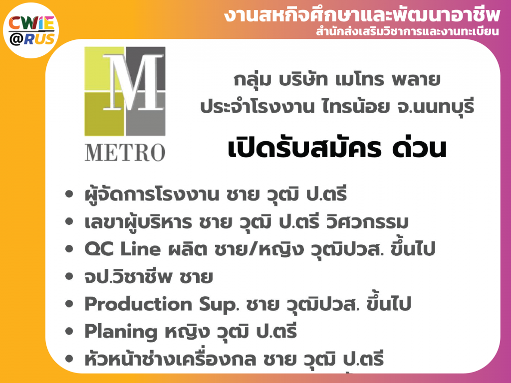 [รับสมัครงาน] กลุ่ม บริษัท เมโทร พลาย