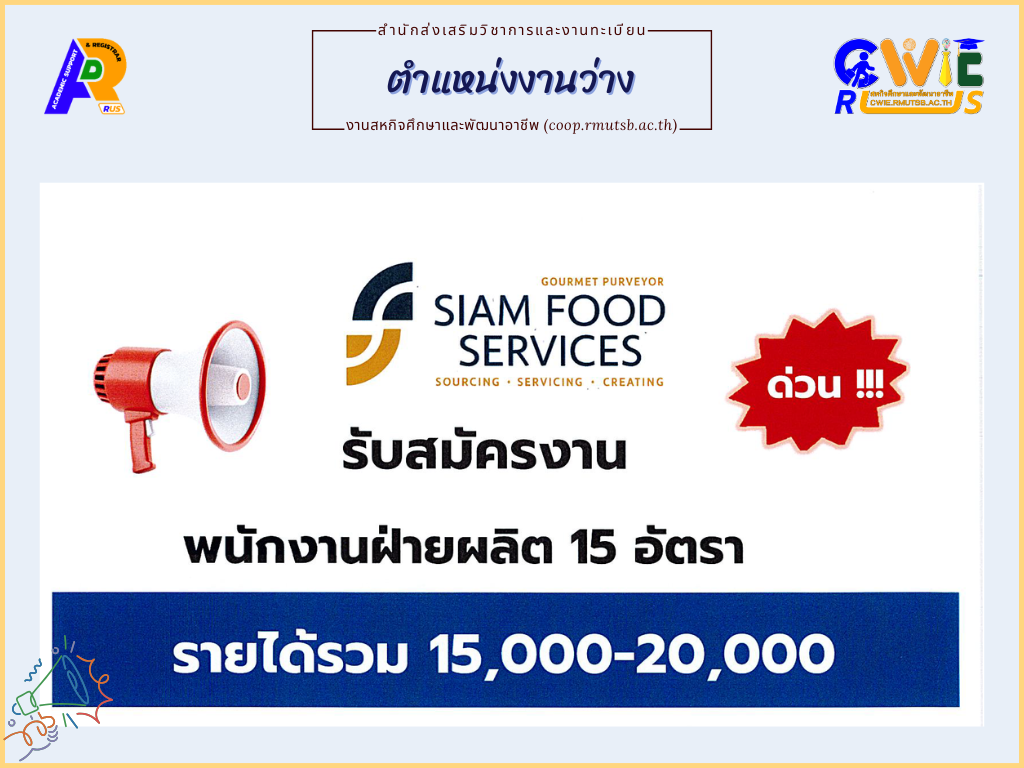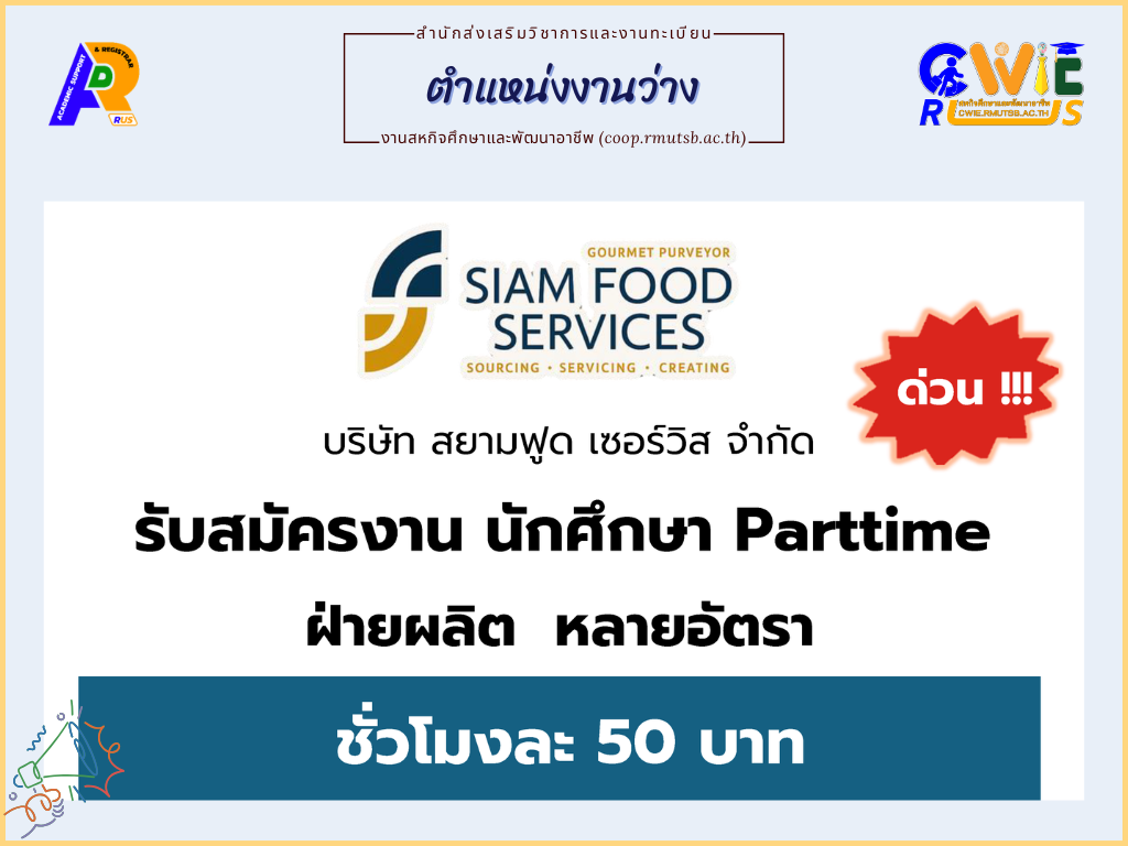 บริษัท สยามฟูด เซอร์วิส จำกัด รับสมัครงาน นักศึกษา Parttime