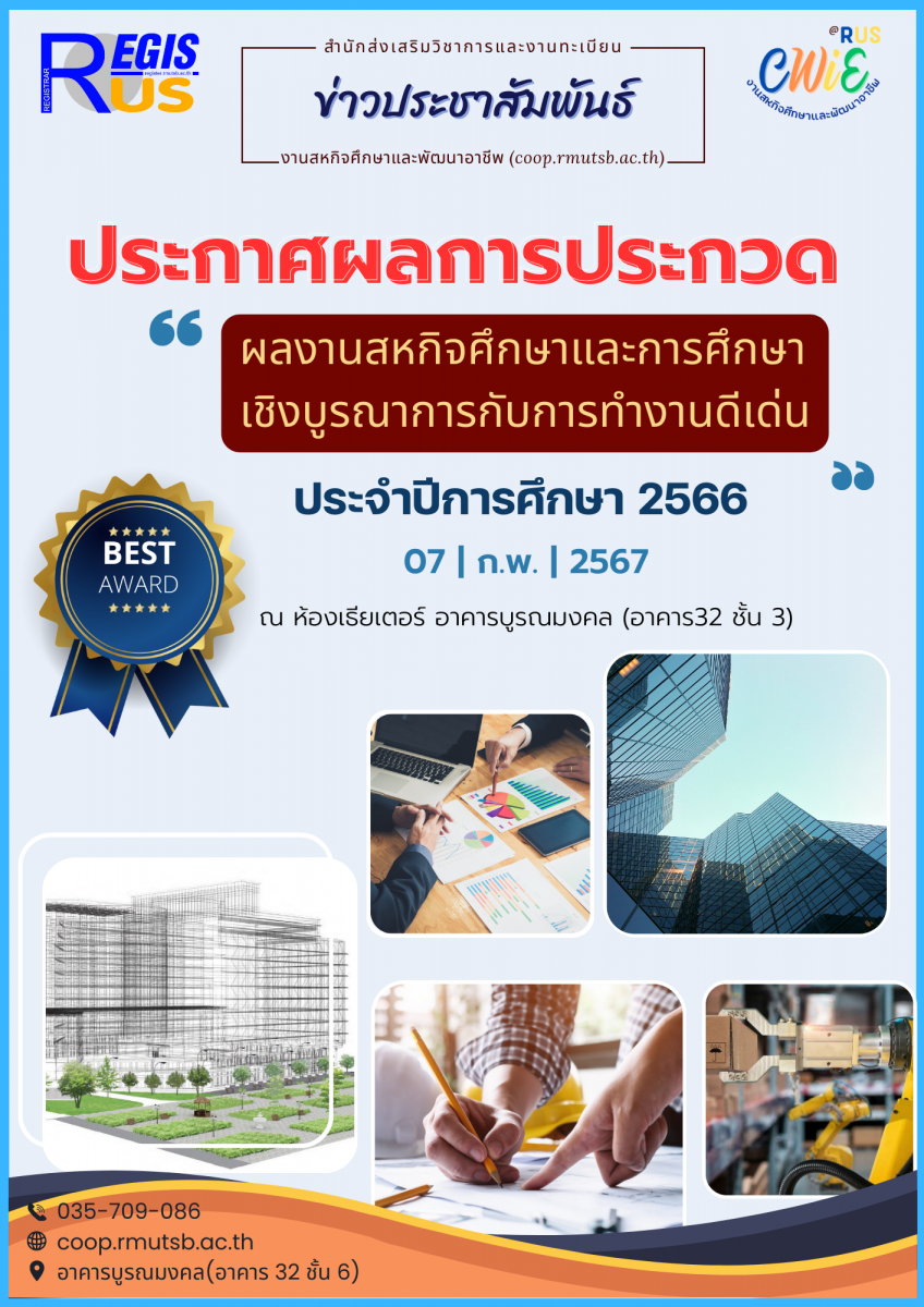 ประกาศผลการประกวดผลงานสหกิจศึกษาและการศึกษาเชิงบูรณาการกับการทำงานดีเด่นประจำปีการศึกษา 2566