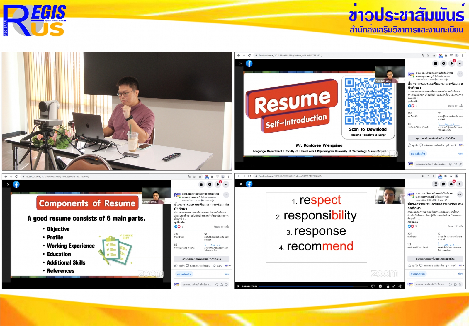 สำนักส่งเสริมวิชาการและงานทะเบียน ศูนย์สหกิจศึกษาและพัฒนาอาชีพ จัดโครงการอบรมเตรียมความพร้อมสหกิจศึกษาสำหรับนักศึกษา เพื่อปฏิบัติงานสหกิจศึกษา ในภาคการศึกษาที่ 1 ปีการศึกษา 2565 ครั้งที่ 5 เมื่อวันพุธที่ 22 ธันวาคม 2564 ในหัวข้อ ภาษาและการสื่อสาร 1 บรรยายโดย อาจารย์กันตวีร์ เวียงสิมา อาจารย์สาขาวิชาภาษา คณะศิลปศาสตร์ รูปแบบออนไลน์ ด้วยสื่ออิเล็กทรอนิกส์ผ่านโปรแกรม Zoom และเผยแพร่ผ่าน Facebook สวท. มหาวิทยาลัยเทคโนโลยีราชมงคลสุวรรณภูมิ