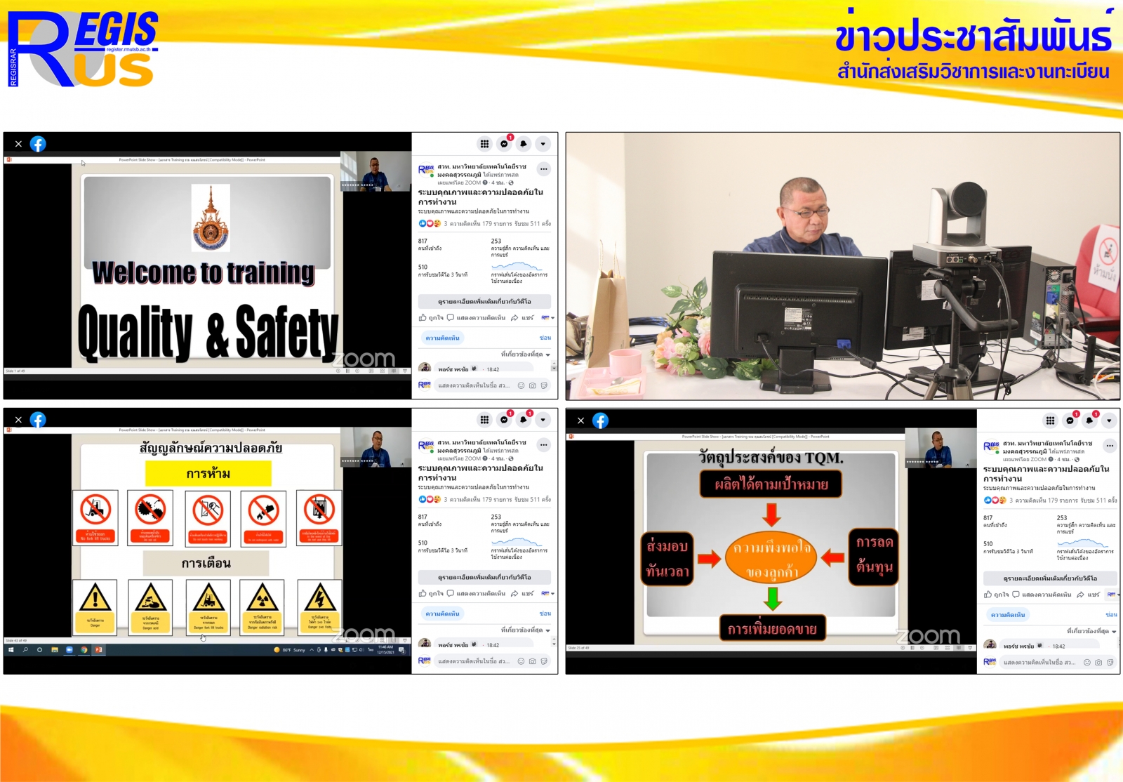 สำนักส่งเสริมวิชาการและงานทะเบียน ศูนย์สหกิจศึกษาและพัฒนาอาชีพ จัดโครงการอบรมเตรียมความพร้อมสหกิจศึกษาสำหรับนักศึกษา เพื่อปฏิบัติงานสหกิจศึกษา ในภาคการศึกษาที่ 1 ปีการศึกษา 2565 ครั้งที่ 4 เมื่อวันพุธที่ 15 ธันวาคม 2564 ในหัวข้อ ระบบคุณภาพและความปลอดภัยในการทำงาน บรรยายโดย คุณสมโภชน์ ชุ่มหฤทัย ผู้จัดการฝ่ายบริหารทรัพยากรมนุษย์ บริษัท ไทยมาโซล จำกัด รูปแบบออนไลน์ ด้วยสื่ออิเล็กทรอนิกส์ผ่านโปรแกรม Zoom และเผยแพร่ผ่าน Facebook สวท. มหาวิทยาลัยเทคโนโลยีราชมงคลสุวรรณภูมิ