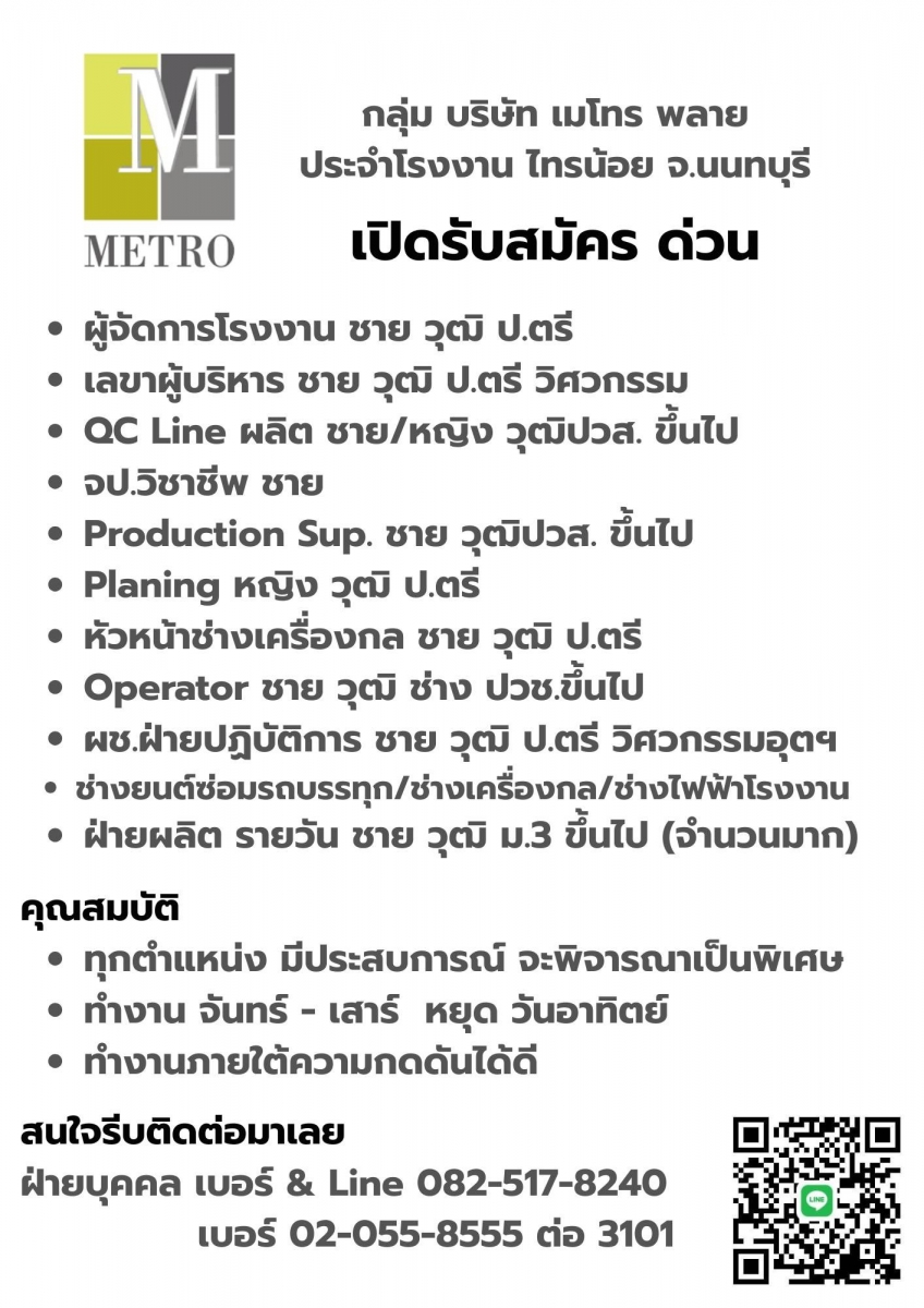 [รับสมัครงาน] กลุ่ม บริษัท เมโทร พลาย