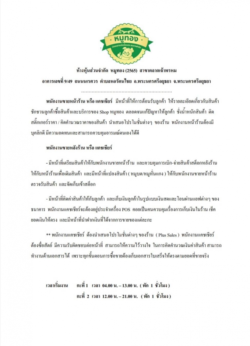 ห้างหุ้นส่วนจำกัด หมูทอง(2565) สาขาตลาดเจ้าพรม รับสมัครงาน