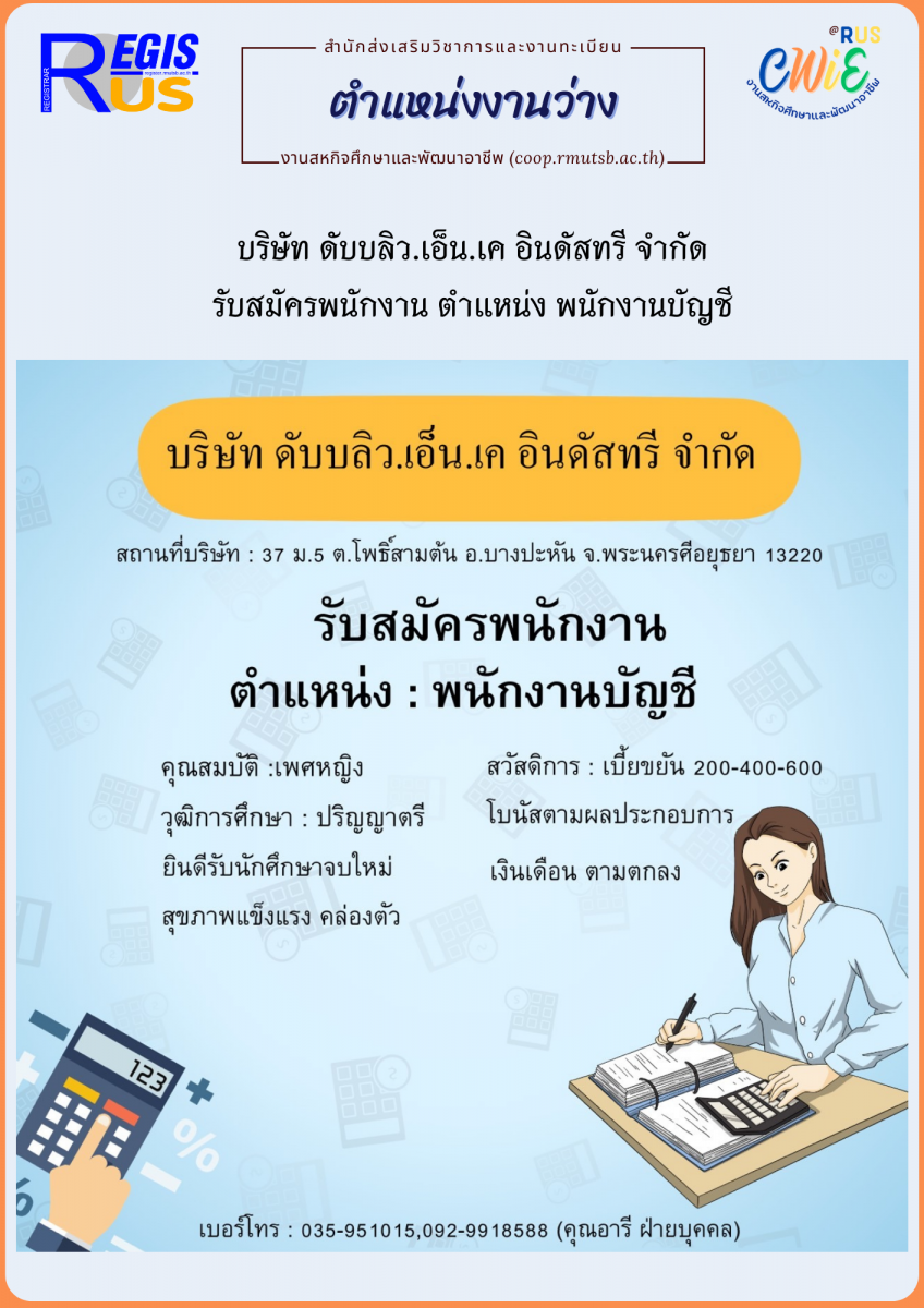 บริษัท ดับบลิว.เอ็น.เค อินดัสทรี จำกัด รับสมัครพนักงาน ตำแหน่ง พนักงานบัญชี