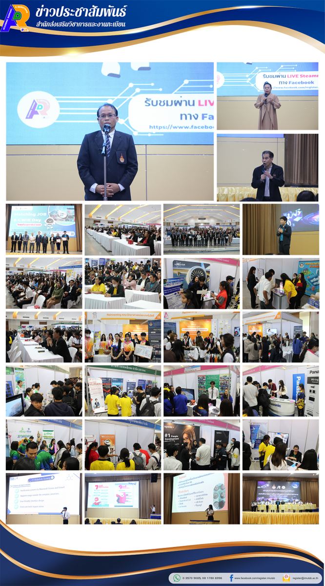 สำนักส่งเสริมวิชาการและงานทะเบียน งานสหกิจศึกษาและพัฒนาอาชีพ จัดโครงการ Matching JOB & CWIE เมื่อวันพุธที่ 5 กุมภาพันธ์ 2568 เวลา 08.00-16.30 น. ณ หอประชุมพระพิรุณ ระลึกโปรดเกล้า มหาวิทยาลัยเทคโนโลยีราชมงคลสุวรรณภูมิ ศูนย์พระนครศรีอยุธยา หันตรา โดยมี ผู้ช่วยศาสตราจารย์ ดร.สุวุฒิ ตุ้มทอง รองอธิการบดีมหาวิทยาลัยเทคโนโลยีราชมงคลสุวรรณภูมิ เป็นประธานกล่าวเปิดโครงการ ซึ่งมีหน่วยงานภายในและภายนอก เข้าร่วมการจัดบูธ แนะแนวการศึกษา บูธ Reinventing บูธสาธิตการสร้างอาชีพของผู้ประกอบการรายย่อย และกิจกรรม Matching JOB & CWIE ระหว่าง นักเรียน นักศึกษา นิสิต บัณฑิต กับสถานประกอบการ เปิดรับสมัครงาน รับสมัครนักศึกษาสหกิจศึกษา และสัมภาษณ์งาน มีสถานประกอบการเข้าร่วมกว่า 34 แห่ง รวมทั้ง กิจกรรมจัดการประกวดผลงานสหกิจศึกษาและการศึกษาเชิงบูรณาการกับการทำงานดีเด่น ประจำปีการศึกษา 2567 เพื่อคัดเลือกผลงานเป็นตัวแทนส่งเข้าร่วมประกวดผลงานสหกิจศึกษาและการศึกษาเชิงบูรณาการกับการทำงานดีเด่น สถาบันการศึกษาในเครือข่ายพัฒนาสหกิจศึกษา ของเครือข่ายอุดมศึกษาภาคกลางตอนบนประจำปี พ.ศ. 2568