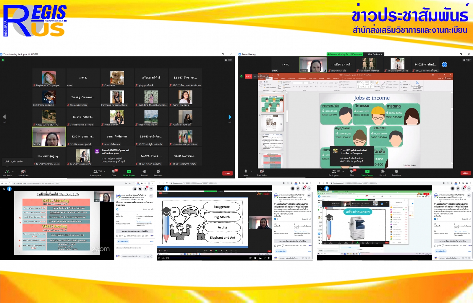 สำนักส่งเสริมวิชาการและงานทะเบียน ศูนย์สหกิจศึกษาและพัฒนาอาชีพ จัดโครงการอบรมเตรียมความพร้อมสหกิจศึกษาสำหรับนักศึกษา เพื่อปฏิบัติงานสหกิจศึกษา ในภาคการศึกษาที่ 1 ปีการศึกษา 2565 ครั้งที่ 6 เมื่อวันพุธที่ 29 ธันวาคม 2564 2564 ในหัวข้อ ภาษาและการสื่อสาร 2 บรรยายโดย อาจารย์สุรวดี สิทธิสระ อาจารย์สาขาวิชาภาษา คณะศิลปศาสตร์ รูปแบบออนไลน์ ด้วยสื่ออิเล็กทรอนิกส์ผ่านโปรแกรม Zoom และเผยแพร่ผ่าน Facebook สวท. มหาวิทยาลัยเทคโนโลยีราชมงคลสุวรรณภูมิ