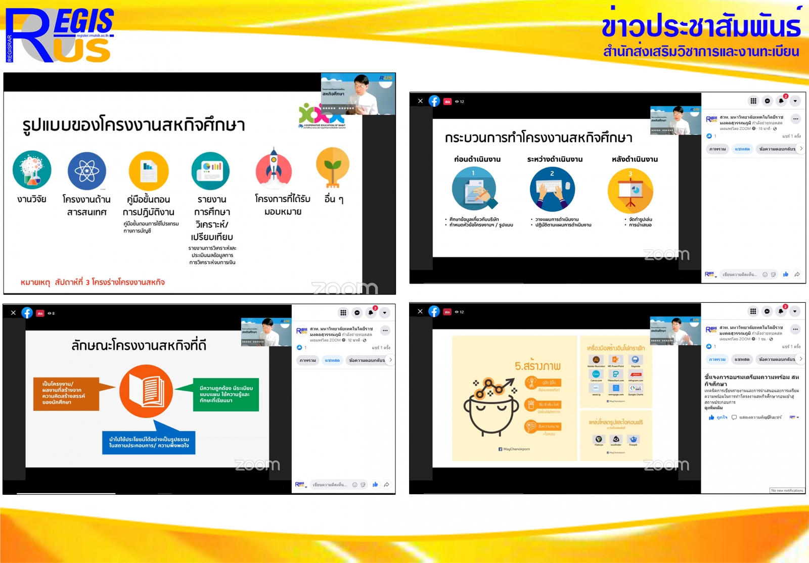 สำนักส่งเสริมวิชาการและงานทะเบียน ศูนย์สหกิจศึกษาและพัฒนาอาชีพ จัดโครงการอบรมเตรียมความพร้อมสหกิจศึกษาสำหรับนักศึกษาเพื่อปฏิบัติงานสหกิจศึกษา ในภาคการศึกษาที่ 1 ปีการศึกษา 2565 ครั้งที่ 3 เมื่อวันพุธที่ 8 ธันวาคม 2564 ในหัวข้อ เทคนิคการเขียนรายงาน การนำเสนอ และการเตรียมความพร้อมในการทำโครงงานสหกิจศึกษาก่อนเข้าสู่สถานประกอบการ บรรยายโดย อาจารย์นพปฎล ขิงทอง อาจารย์สาขาวิชาการตลาด คณะบริหารธุรกิจและเทคโนโลยีสารสนเทศ รูปแบบออนไลน์ ด้วยสื่ออิเล็กทรอนิกส์ผ่านโปรแกรม Zoom และเผยแพร่ผ่าน Facebook สวท. มหาวิทยาลัยเทคโนโลยีราชมงคลสุวรรณภูมิ