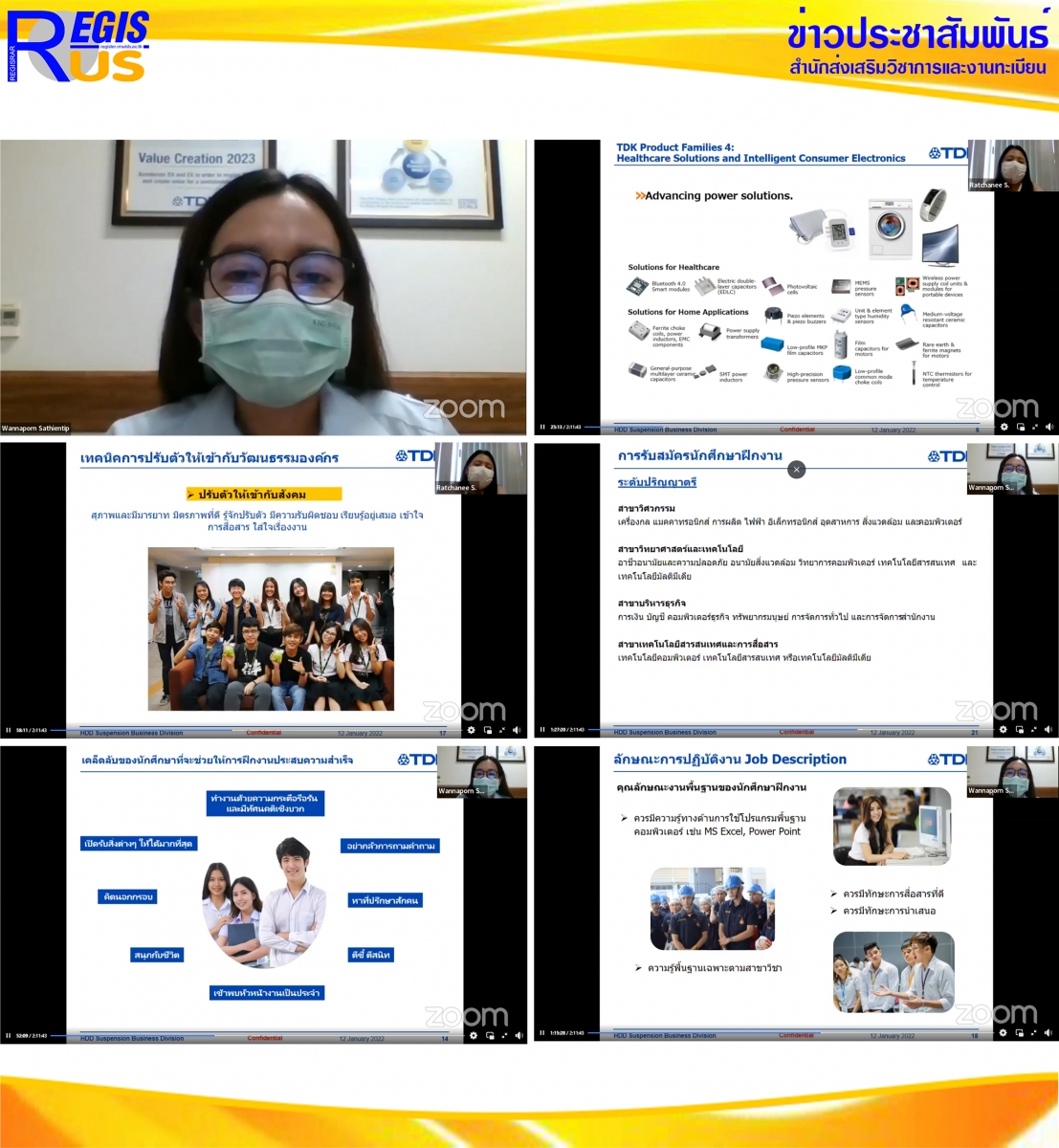 สำนักส่งเสริมวิชาการและงานทะเบียน ศูนย์สหกิจศึกษาและพัฒนาอาชีพ จัดโครงการอบรมเตรียมความพร้อมสหกิจศึกษาสำหรับนักศึกษา เพื่อปฏิบัติงานสหกิจศึกษา ในภาคการศึกษาที่ 1 ปีการศึกษา 2565 ครั้งที่ 8 เมื่อวันพุธที่ 12 มกราคม 2565 ในหัวข้อ วัฒนธรรมองค์กรและข้อมูลสถานประกอบการ บรรยายโดย คุณวรรณพร เสถียรทิพย์ ตำแหน่ง เจ้าหน้าที่อาวุโส แผนกพัฒนาทรัพยากรณ์บุคคล บริษัท บริษัท แมกเนคอมพ์ พรีซิชั่น เทคโนโลยี จำกัด (มหาชน) รูปแบบออนไลน์ ด้วยสื่ออิเล็กทรอนิกส์ผ่านโปรแกรม Zoom และเผยแพร่ผ่าน Facebook สวท. มหาวิทยาลัยเทคโนโลยีราชมงคลสุวรรณภูมิ