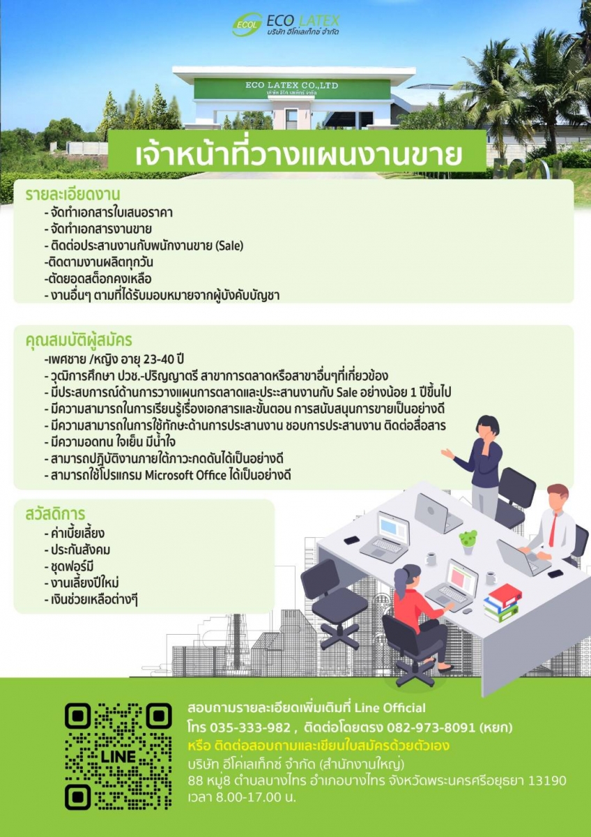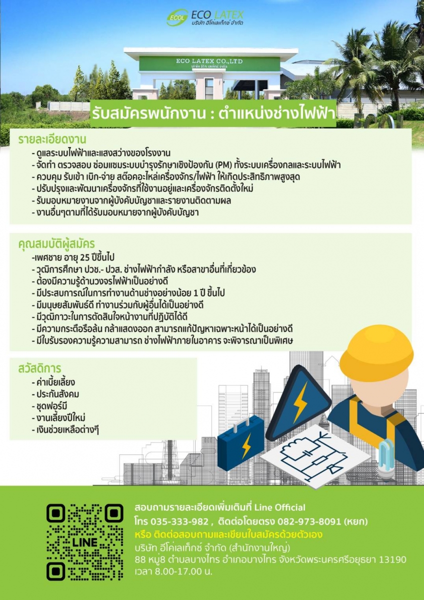 บริษัท อีโค่เลเท็กซ์ จำกัด รับสมัครพนักงาน ตำแหน่งช่างไฟฟ้า และ เจ้าหน้าที่วางแผนงานขาย