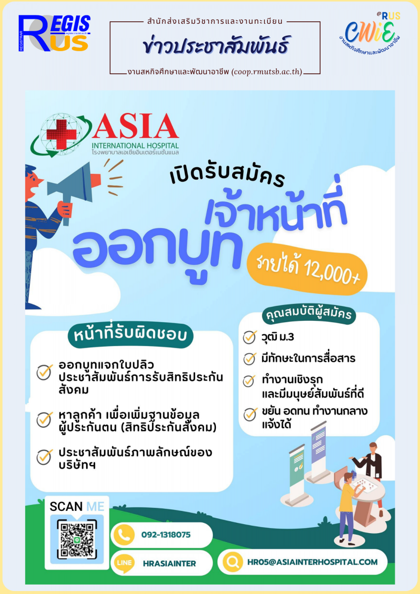 โรงพยาบาลเอเซียอินเตอร์เนชั่นแนล เปิดรับสมัคร เจ้าหน้าที่ออกบูท