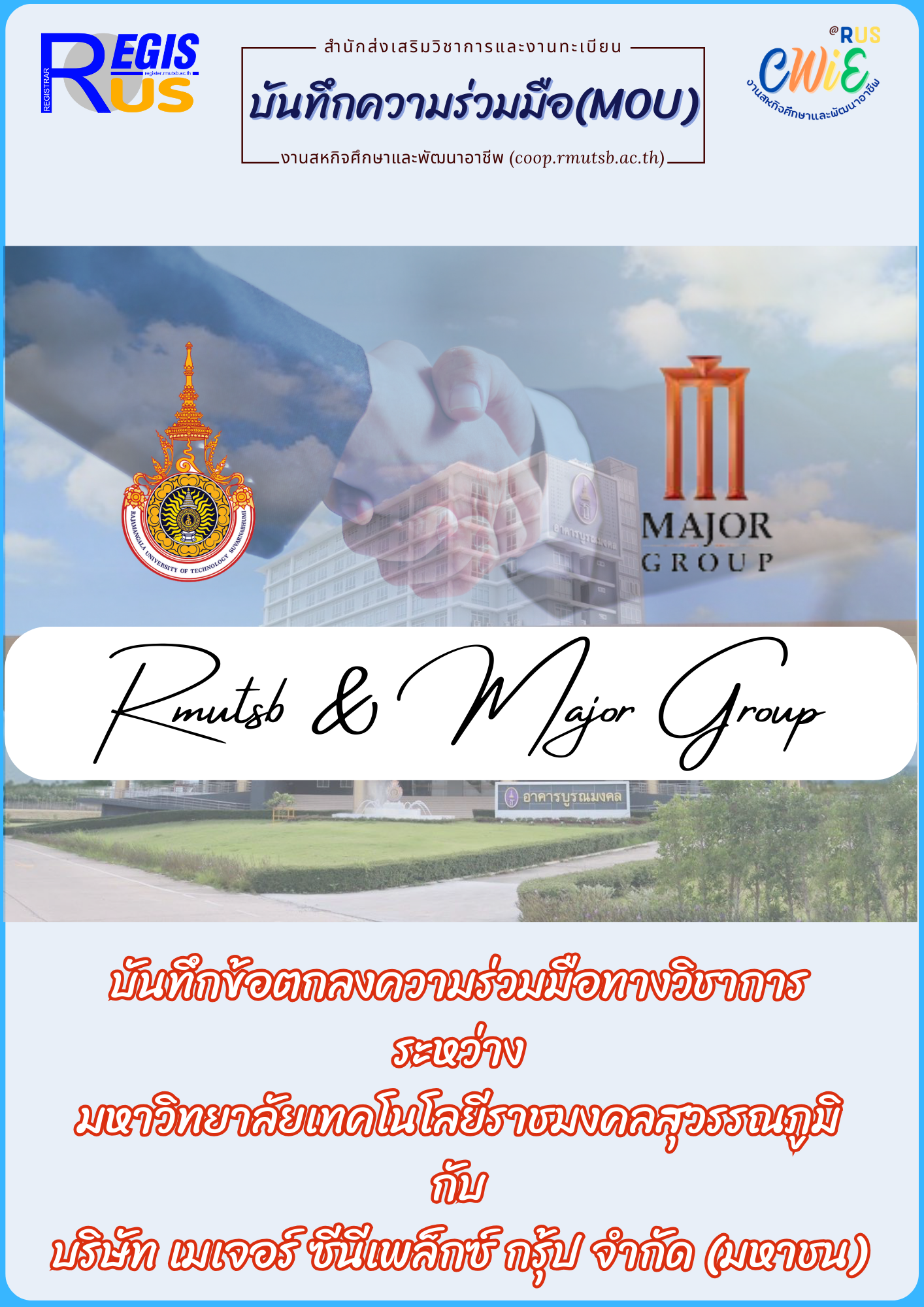 บันทึกข้อตกลง มหาวิทยาลัยเทคโนโลยีราชมงคลสุวรรณภูมิ กับ บริษัท เมเจอร์ซินีเพล็กซ์ กรุ้ป จำกัด (มหาชน)